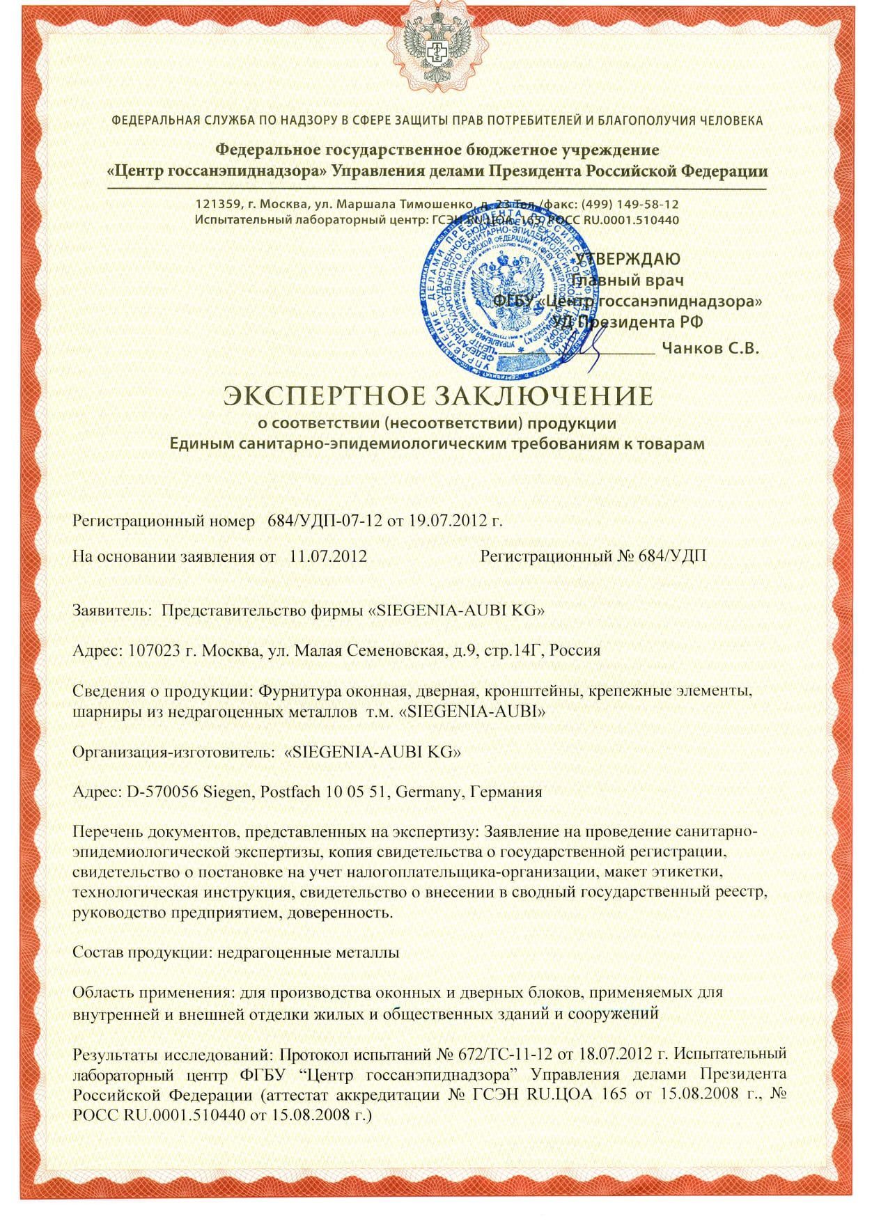 Экспертное заключение о соответствии санитарно-эпидемиологическим требованиям фурнитуры SIEGENIA